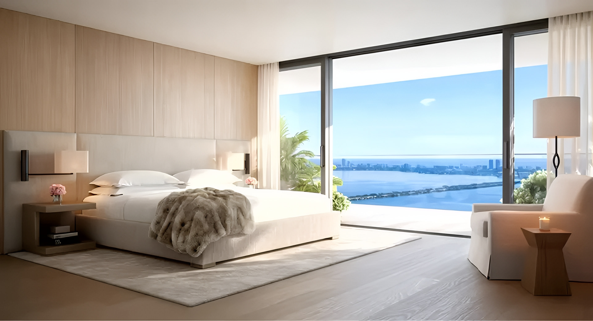 - Large glass openings and sliding doors